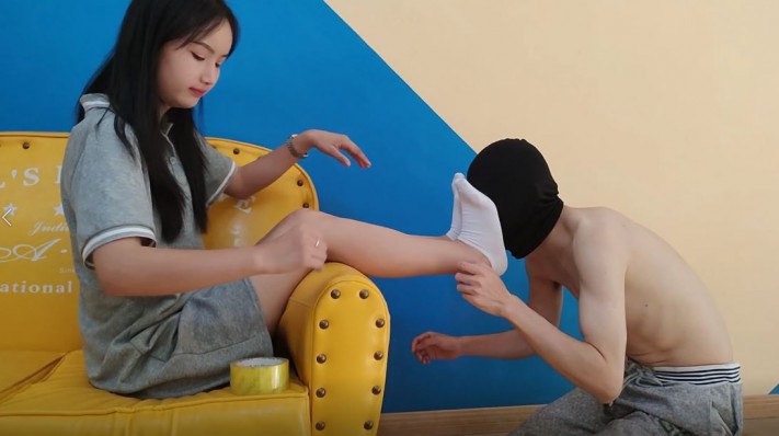 梦晨小姐姐逛街回来,让家奴躺着先把鞋里的味道吸干净全部吸到肺里并且还拿塑料袋把整个头包住,当然小姐姐手也没闲着,玩着手机掐着乳头,感觉家奴吸干净味道了就开始吸棉袜脚上的气味并且拿胶带把家奴的头和棉袜脚绑到一起强行除臭