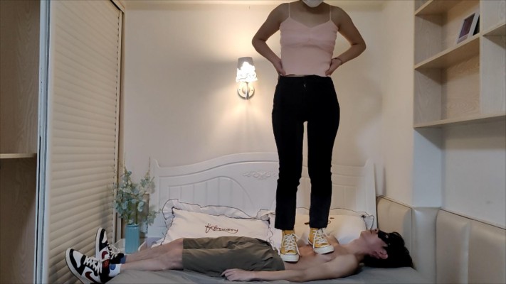 踩得是一个19岁的弟弟,体重只有90斤,但是很喜欢被踩,我踩上去的时候他脖子的青筋都突起来了,身上也都踩得全是鞋印。
