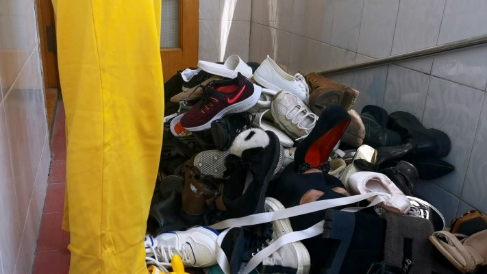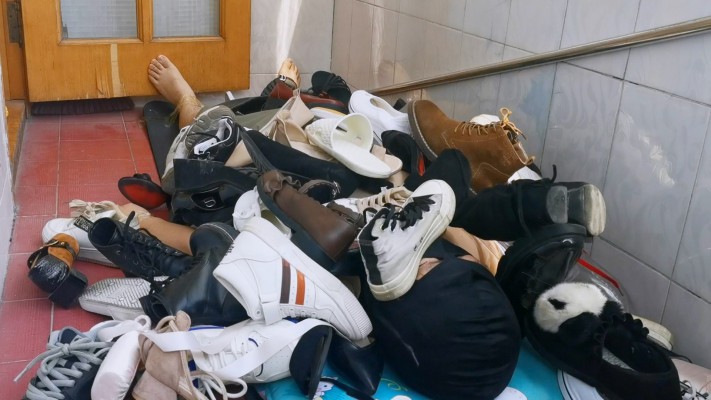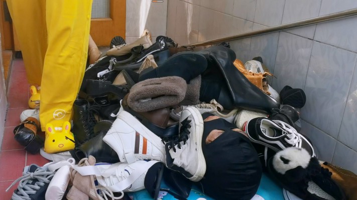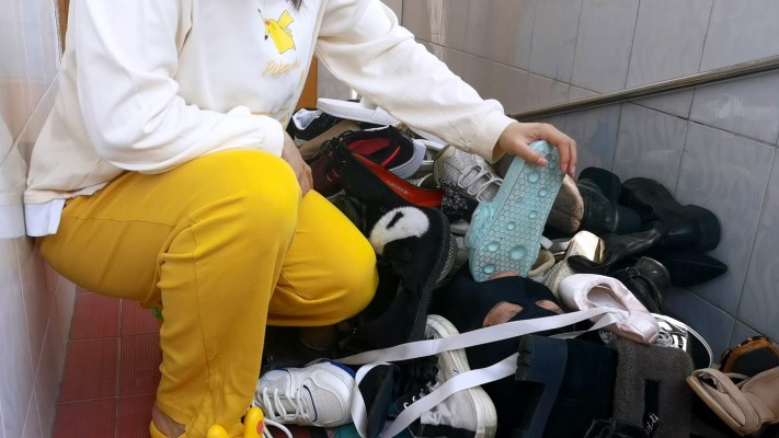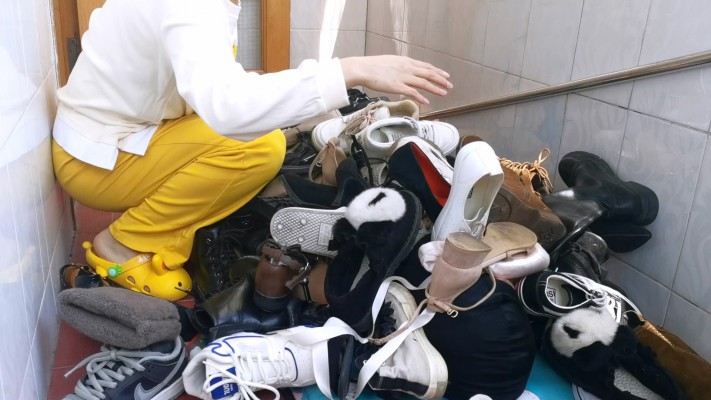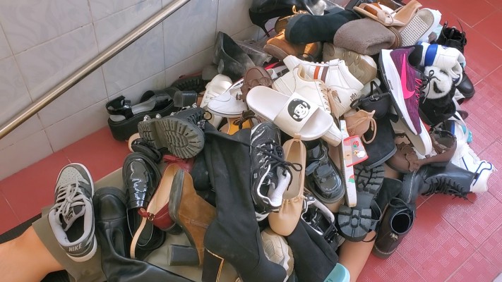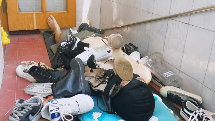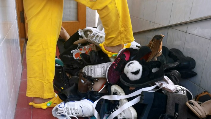 一开始先把毯子用胶带牢牢固定在地上让他不能动弹,然后我站在屋外再把50双鞋一只一只扔到毯子的身上、脸上和下面。鞋的种类很多,大部分鞋子的鞋底是很坚硬的,还有高跟鞋,靴子这样的鞋子,打到毯子脸上应该会很痛,好几双鞋跟就直接远距离砸到毯子的正脸上。