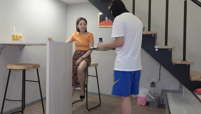 服务员给美女送餐,东西掉地下服务员在地下看半天,美女询问看什么,并挑逗服务员,服务员立马显示出对美女脚的迷恋,美女便开始训练服务员怎样成为一名合格的脚奴。