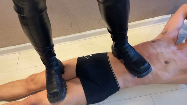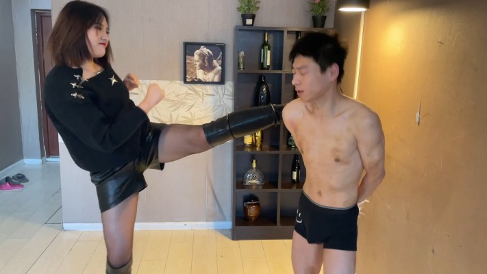 身高187的巨人女S VS 身高169 瘦鸡男M 反差感极强的一部作品,女主对男M进行暴力踢击和踩踏,身高体重的优势让女主每一脚对于男M来说都是重击,最后男M伤痕累累被驯服,跪在女主前舔舐着女主的黑色皮靴。
