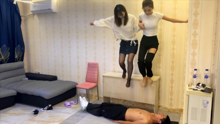 冷鸢和妍妍两位大大,被毯子邀请过来踩他,一顿暴踩,一个劲在蹦,还从高处蹦下来(将近一米的桌子,双人一起跳下来)。毯子以为也就这样了,但是没想到更暴力的还在后面,双人全体重踩头(双人全体重单脚也有),双人单脚踩脖子、窒息式的踩踏,给毯子踩的一个劲咳嗽求饶。