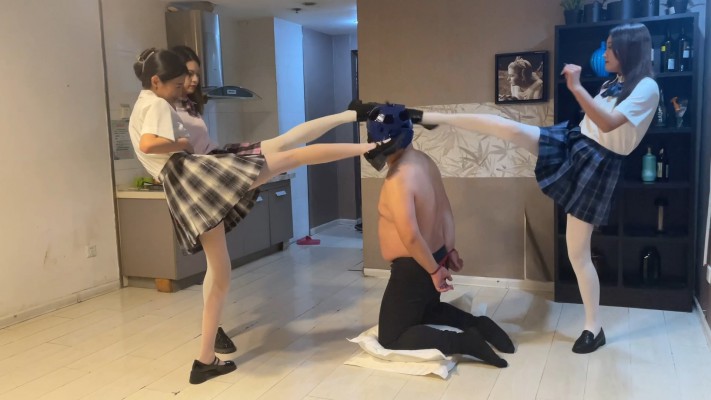 内容:三名身穿JK制服的女孩,以校园霸凌的方式欺辱一个蠢笨胖男生,强制其站立和跪下,三双硬质皮鞋的脚交替轮番的轰在头部上,即使带着防护头套,那击打的冲击力也是让男生几乎脑震荡般的击打感,几乎20分钟连续持续的头部暴踢,之后又进行了强制踢裆和腿绞虐乳,最后三位美女合力将男生踢昏死过去,踩着他自拍为乐,场面真的是暴力与美丽的交织。