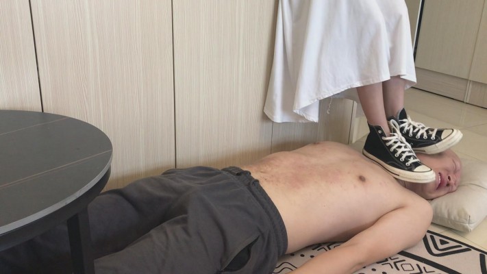 全新素人S美竹姐姐,00后美女,美竹姐姐今天穿了双黑色的匡威帆布鞋,先是让小M把鞋底舔干净,然后对下体一顿踢,最后跳到小M身上踩踏