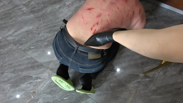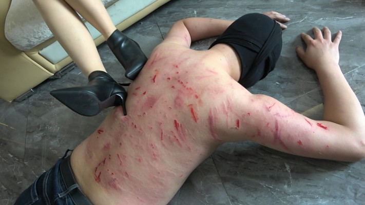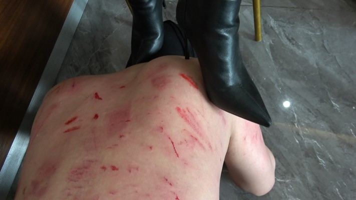贱狗放了一次鸽子并迟到(真实放鸽子)彻底激怒了彼岸花,决定用三双鞋残忍惩罚贱狗。第一双靴子暴喘,都是用靴跟踹,完全不顾贱狗疼痛,彻底发泄的踹,然后换上长方形跟网红鞋,鞋跟十分锋利,几乎每脚都是用鞋跟踹,贱狗不停饶命,想用胳膊裆,可胳膊就惨了,踹的血迹斑斑。接下来换的短靴鞋跟堪比刀刃了,胳膊挡踹胳膊,胳膊没个样子了,后背踹的皮连着肉,最狠的是一脚把皮踹来飞出去了,清晰可见,先白后红,贱狗不断蠕动,吧台粘的都是血,太残暴了,就是干废贱狗的节奏。看着贱狗胳膊后背的血迹,彼岸花目的达到了并安慰抚摸贱狗.