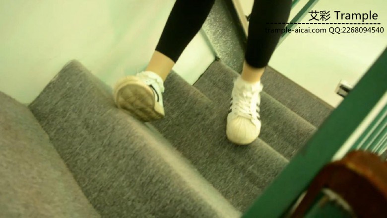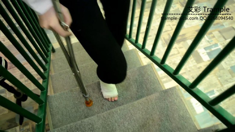①在楼梯下楼,不小心崴脚扭伤,坐在楼梯上揉脚喊疼②勉强下楼,瘸得厉害,走了几步又坐下脱了鞋下楼,瘸得更厉害了③只穿袜子在地上走,一瘸一拐的走④脚踝缠上绷带,拄着拐杖单脚跳