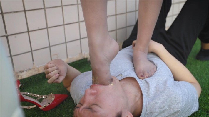 麦可颂在楼台调教小奴,高跟踩踏全体重踩踏;调教舔鞋;然后直接将灰丝脚插进小奴的嘴里深喉,没多久小奴就坚持不住,将胃里的食物吐了出来。麦可颂一边玩虐,一边羞辱着这可怜的小奴。