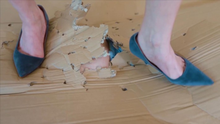 灵灵在小胖奴身上前后放上三张纸皮,全程穿细高跟踩踏。虽然视觉上隔着纸皮,给奴一种缓冲的错觉,实际上随着灵灵下脚一跺,纸皮立即穿透,鞋跟踩进奴的肉里。最终三张纸皮在灵灵的重跺之下全部破烂,灵灵满意地离去。