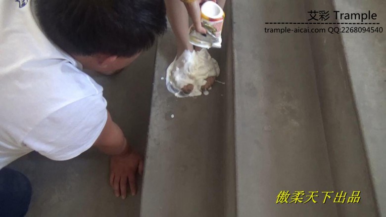 傲柔小主带狗奴来到楼道,用酸奶洗脚,走在台阶上,边走边让狗奴舔食酸奶,并混合地上的脏泥一起给狗狗吃。