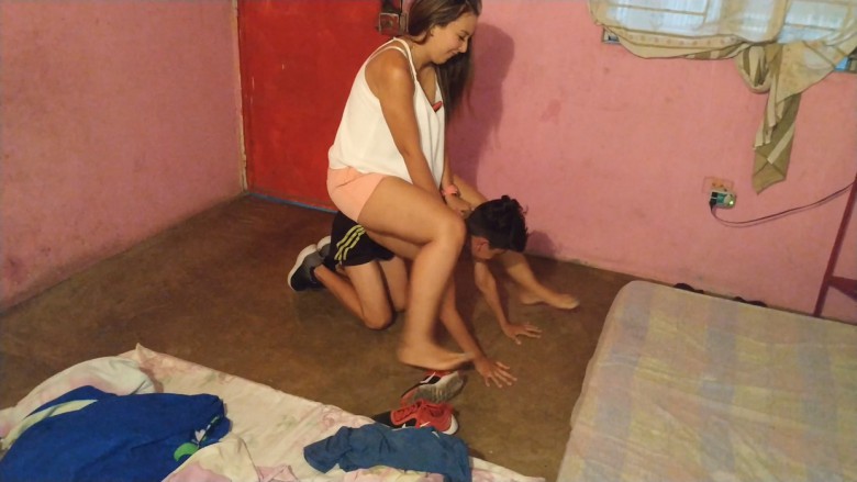 粉色热裤美女和少年玩踩踏