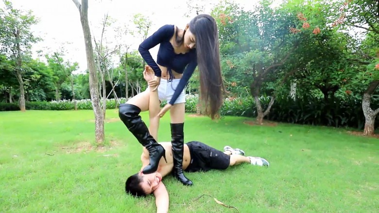 大热天时跑到公园里拍视频,还穿着长靴,也不知道当时怎么想的。男m光着身子被踢,有人经过还差点去抱JC蜀黍去了,哈哈哈。这部是芷晴各种动作踢男m,可惜的是这个m不是很能抗,没一个能打的...