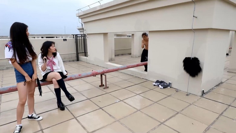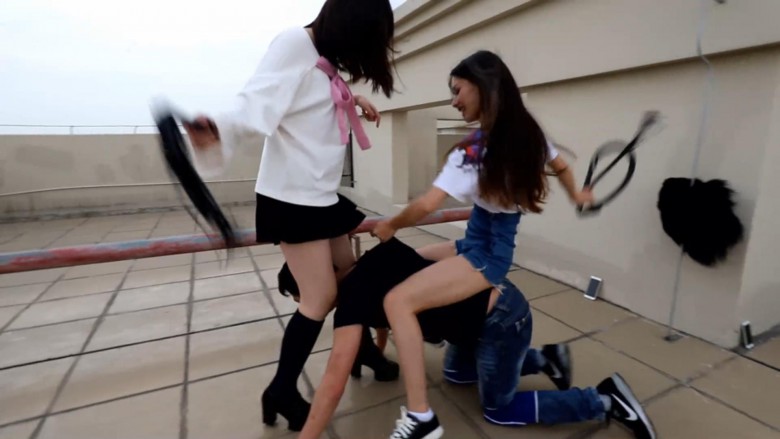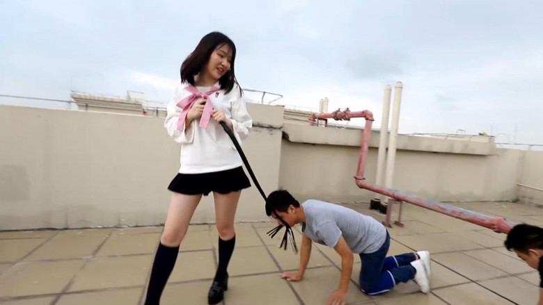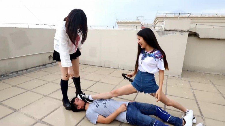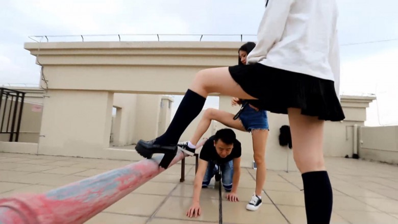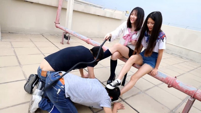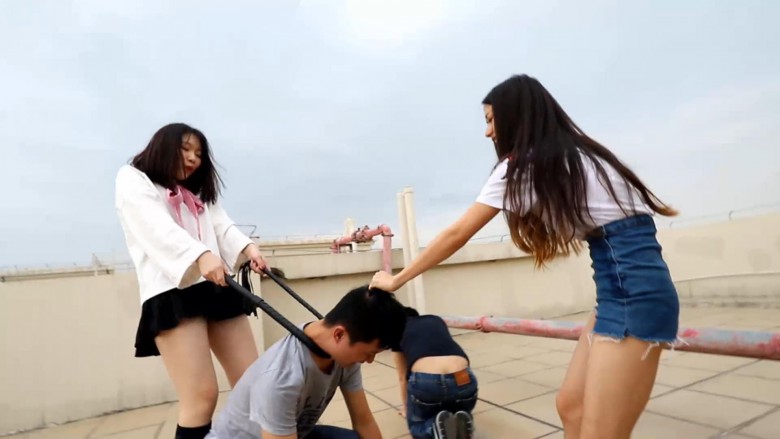萱、芷晴在天台花式调教3个男奴。鞭子、耳光、羞辱钻跨、骑马遛狗、踢打、舔鞋等等。把两个m虐得受不了,后来发现一个在后面躲着看的m,也扯过来,踩得他满身鞋印....