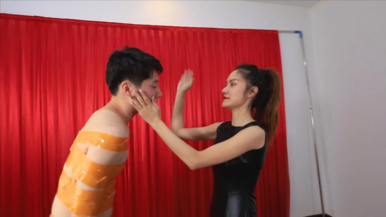 男m身体被胶带缠绕着,尔岚s耳光羞辱后,用网袜脚全体重踩踏、踩脸。然后把男m当成坐垫一样坐脸窒息。男m想要挣扎却无能为力。
