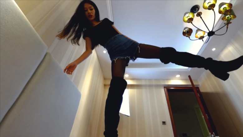 芷晴分别穿过膝长筒靴和黑丝脚踩踏。全体重踩裆部、跳踩、跪轧、踮起脚尖全体重踩脖子等。库存作品中的精品!