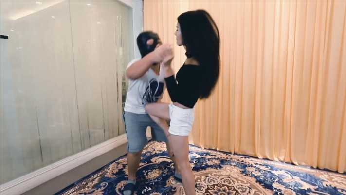 芷晴教训挑衅的笨重大聪明,踢踹、膝顶、高踢。