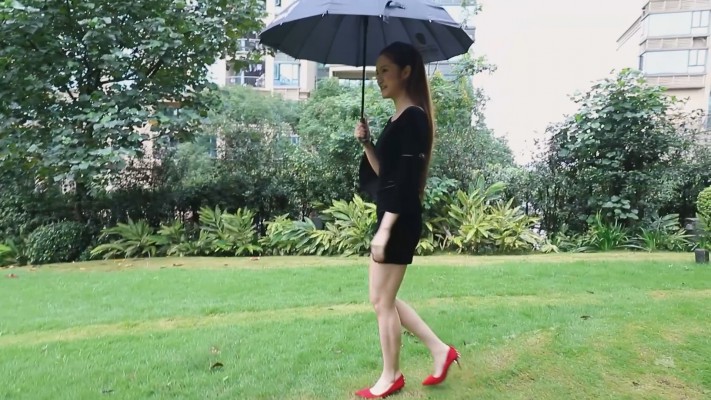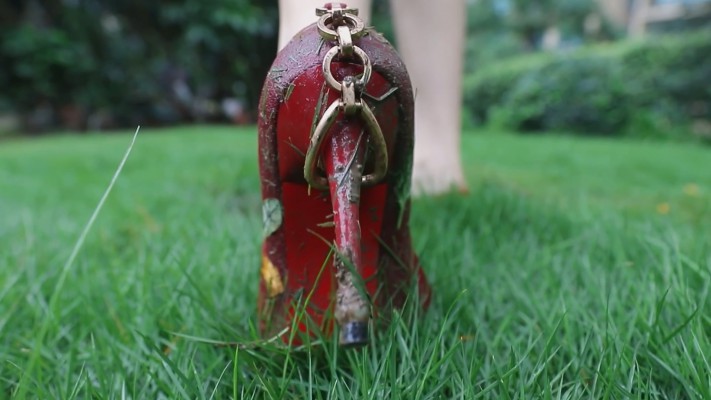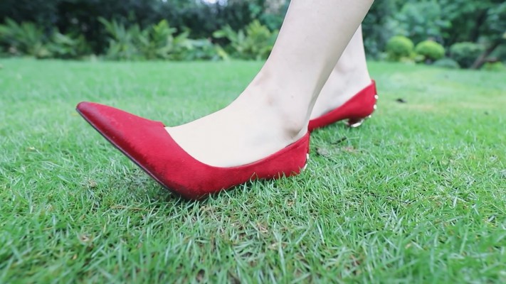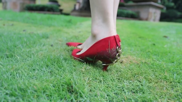 尔岚穿着鲜艳的红色高跟鞋,将锐利的鞋跟刺入草坪泥土中。