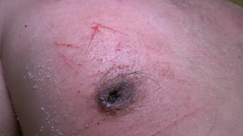 全体重长靴长时间不间断踩踏乳头,烟烫乳头,针头烧红烫乳头,针头扎乳头,穿刺,伤口吐口水撒盐后暴踩乳头,贱狗嚎叫不断,最后乳头已不成样子,惨不忍睹。