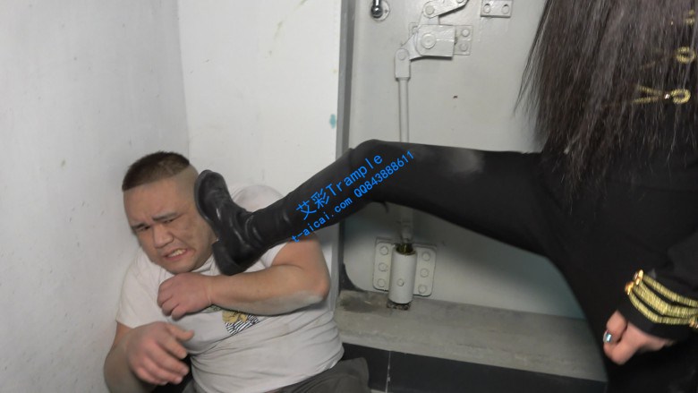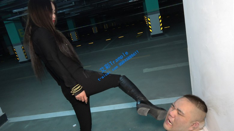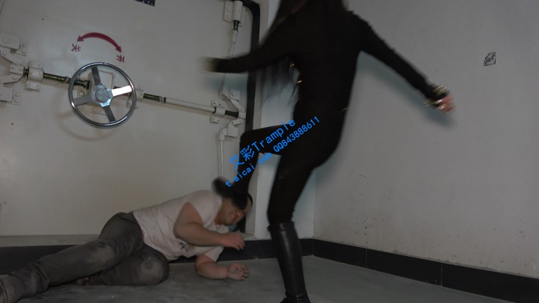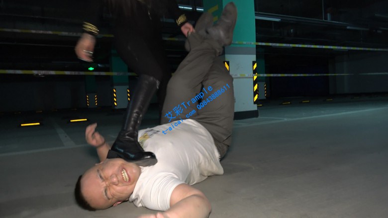 地下车库豪橫女与二愣子发生摩擦并被羞辱,豪橫女迅速制服二愣子,开始硬底皮靴凶狠踹脸,爆头,非常豪橫。