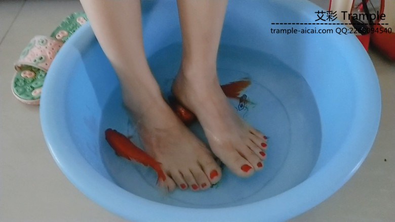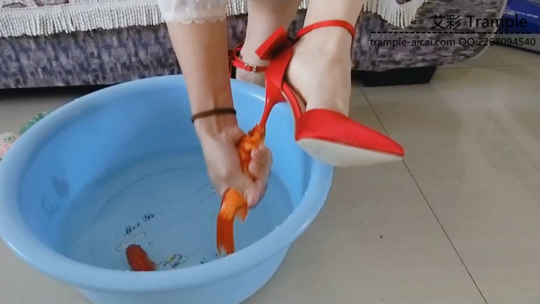两条小金鱼在水盆里愉快的游着 他们还不知道死期将近 芷君小姐姐 脱掉鞋子 白嫩的小脚放在水盆里 和小金鱼们来个亲密接触 然后穿上高跟 让两条调皮的金鱼吃鞋跟,长长的鞋跟让他们痛并快乐着~~