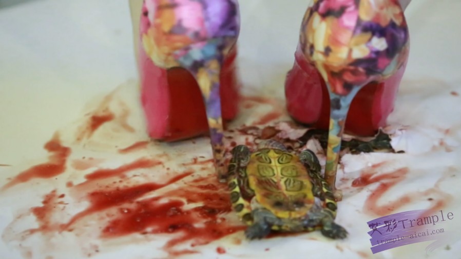 模特小莹第一次突破,但下脚竟然完全不留情。鞋跟一脚踩在龟壳上小龟直接出了水还射得很高,然后还用细跟直接踩小龟脖子不停旋转。