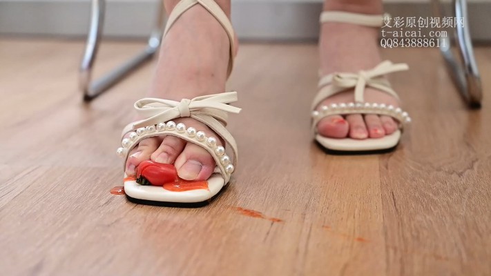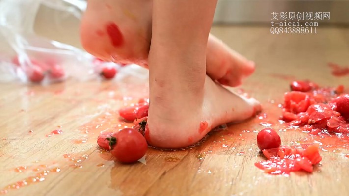 这个视频呢是Alice裸足穿着凉鞋把一个个小番茄制作成番茄酱的过程。Alice先用脚趾压碎了一个又一个小番茄,然后用足跟碾压。或许还是足跟的效率更高,Alice更加倾向于用足跟碾。足跟的威力也是显而易见的,小番茄们一个个爆浆喷射得到处都是,最远甚至喷到了床的另一边。最后Alice脱下凉鞋直接裸足碾压搅拌小番茄们。