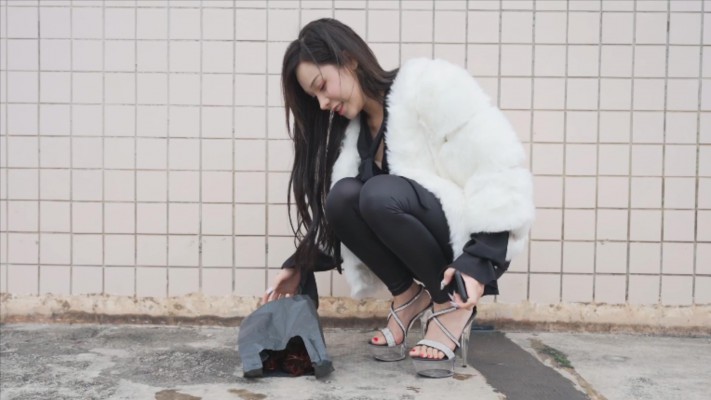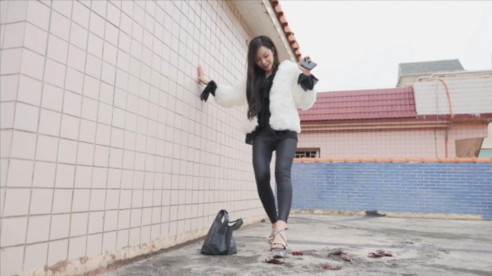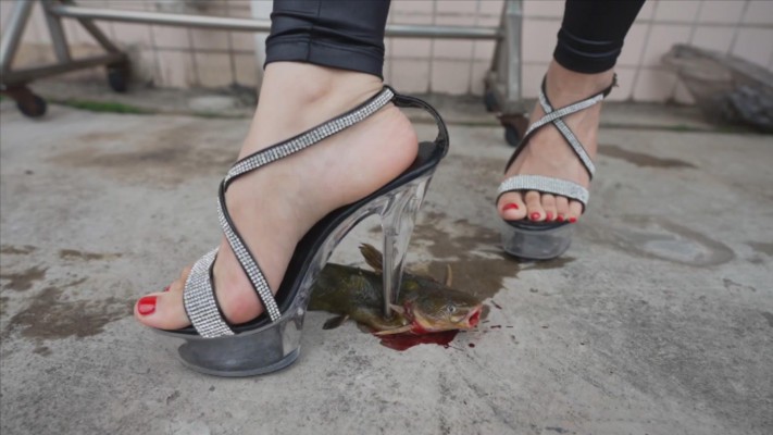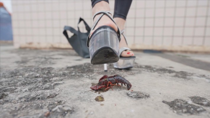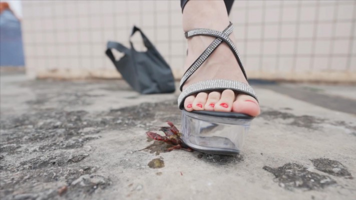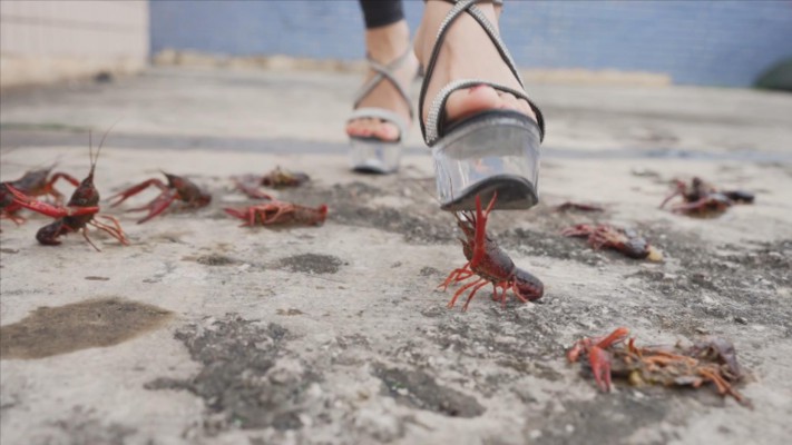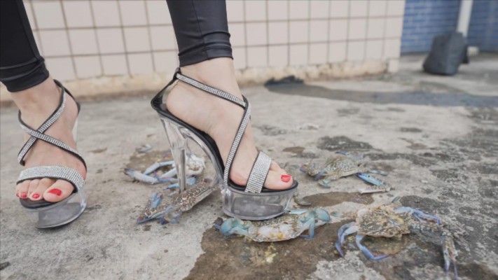 星奈s穿着透明防水台的高跟鞋,一脚一脚地踩碎小龙虾的脑部、钳子等部位。虽然小龙虾撑起双手,但在星奈的脚下,也无力抵抗生命无法承受之重,被踩成一滩肉泥,汁液四溅。随后星奈又伴着无意识路过,踩碎了一只只螃蟹,跟一条鱼,并将鞋跟插入鱼的嘴里。