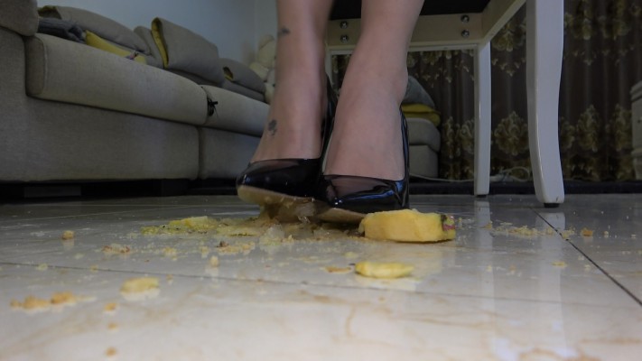 高跟鞋踩碎水果,不断羞辱诱惑挑食美脚下的食物,挑逗贱狗品尝,下部强迫贱狗舔高跟鞋和吃掉高跟踩碎的美食。