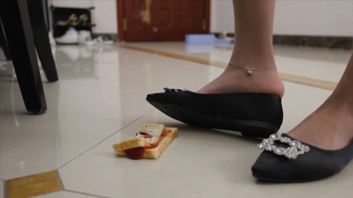 芷晴工作回到家后,挑鞋整理短丝袜袜尖,踩过期的面包,踩笔盖,再将蘸了番茄酱的面包踩碎,番茄酱沾满了丝足