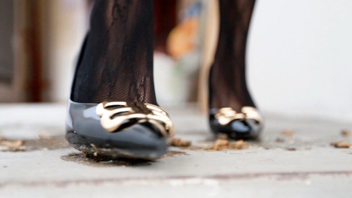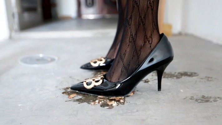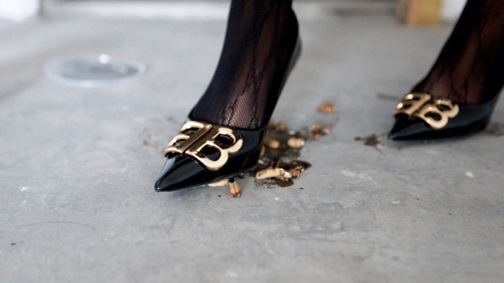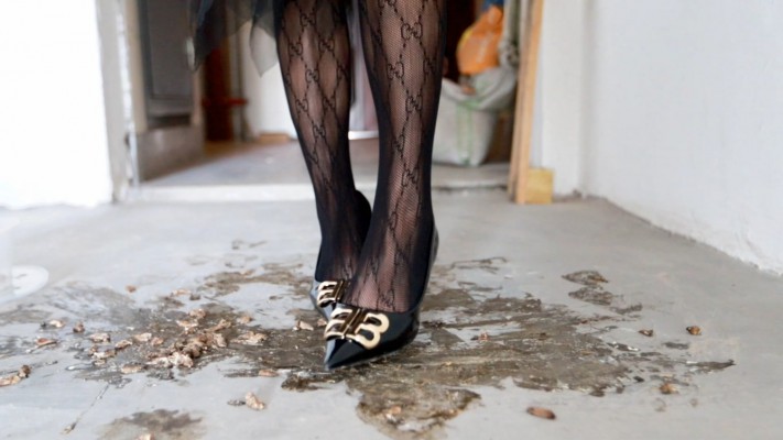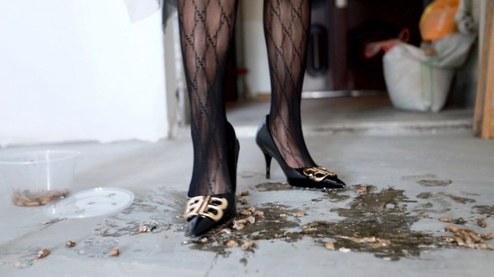 高冷女神甜美裙配高跟凉鞋碾踩爆大蜗牛