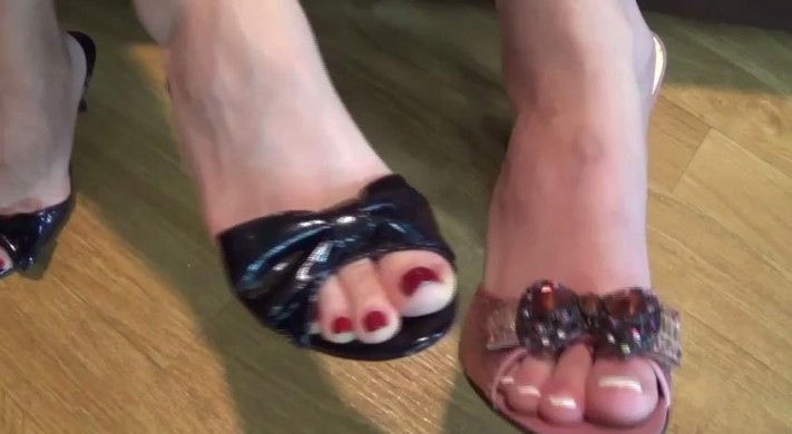 俩女比基尼高跟鞋里脚跟踩,鞋跟插金鱼