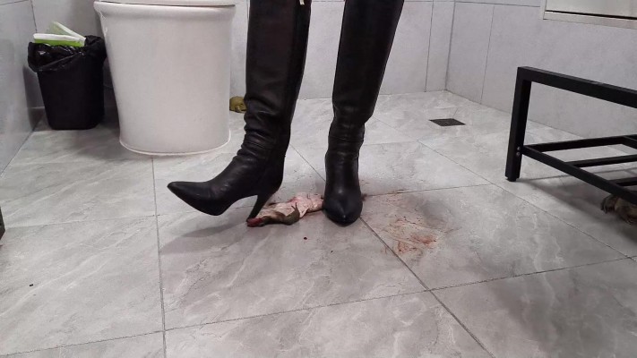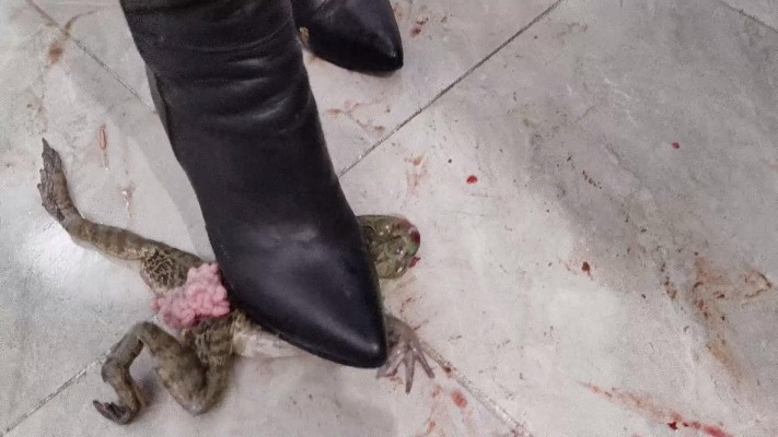 仙宁j官高跟皮靴踩爆3只牛蛙