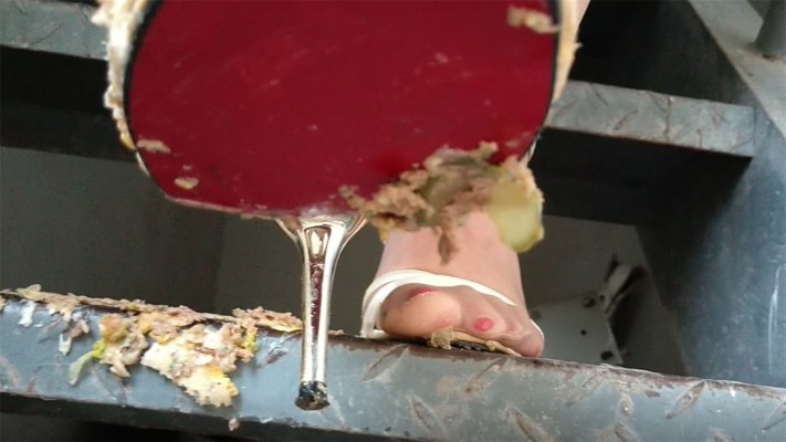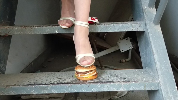 地毯和楼梯间户外双场景踩踏巨无霸汉堡,10cm细鞋跟猛插汉堡,挑逗喂食,高清慢镜头鞋底细节展示,无意识楼梯间上下楼梯往复踩踏