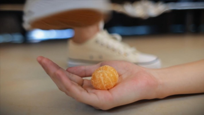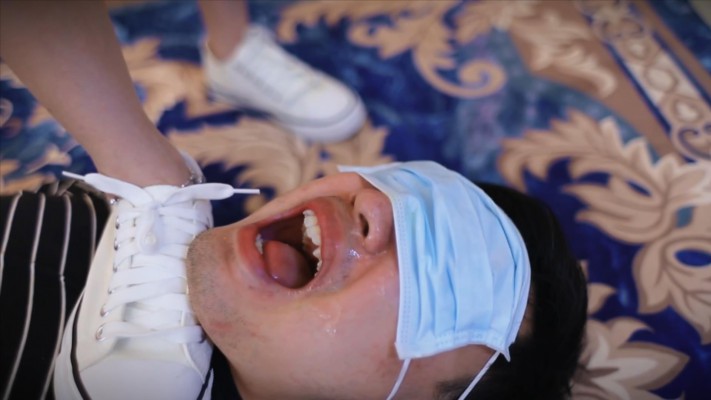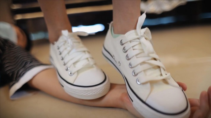 芷晴帆布鞋踩奴的手,在奴的手上碾碎橘子让他吃,又碾踩奴的脸,语言羞辱他。