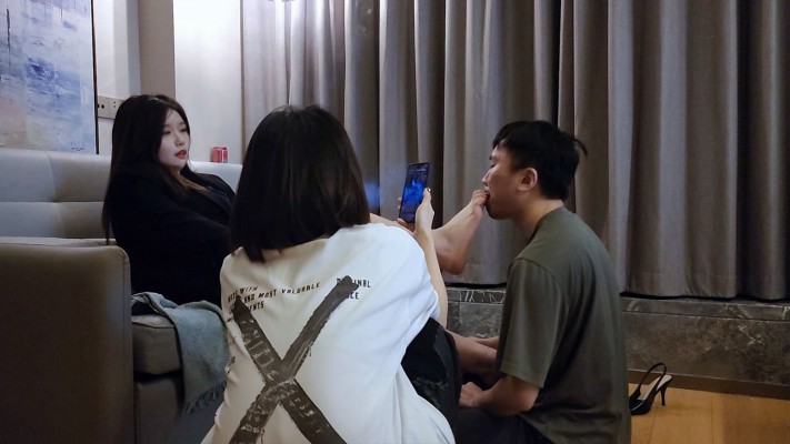 一位美女脚深喉调教脚奴,脚耳光虐打,130斤全体重踩脸,脚虐舌,另一位美女在旁拍摄围观。