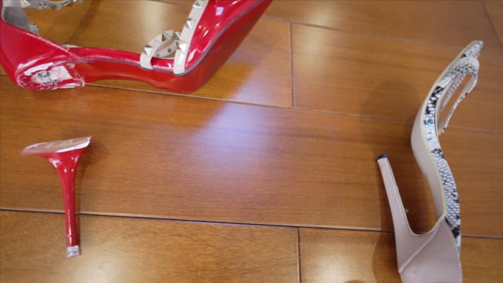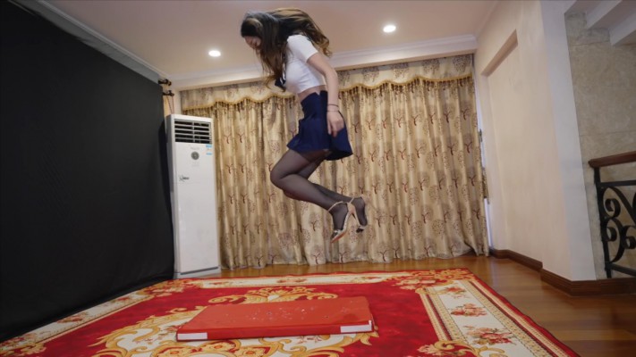 麦可颂发泄式的暴踩垫子,每一脚都铿锵有力。穿了两双高跟鞋进行踩踏,两双都踩坏了。 一双鞋跟向内崴了,一双鞋跟都脱离了,足以证明惊人的破坏力! 通过暴力跺脚、跃起再全体重用鞋跟刺下,将一张垫子的正面和反面都踩穿,孔洞遍布了垫子... 还有大升格慢放了精彩片段!不容错过