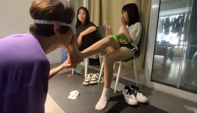 两个小美女一边吃零食一边享受让贱狗轮流舔脚,夏天穿着运动鞋脚特别酸臭,还把狗头踩进鞋里让他呼吸,最后又让贱狗舔脚底,一起踩脸玩够了才放过他