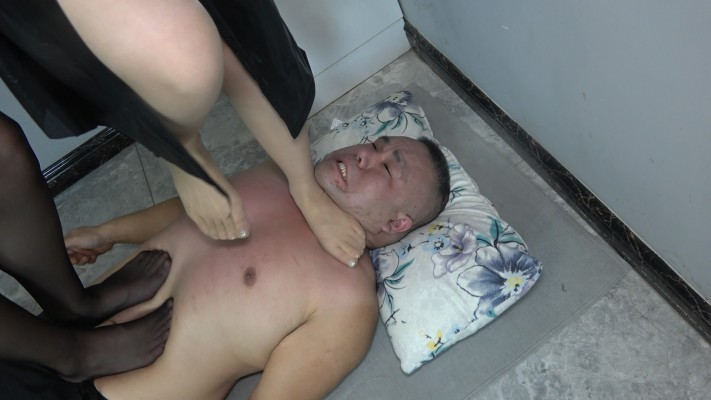 双主踩脖子窒息,全体重踩在脖子上丝毫不留情,结结实实踩住脖子上让贱狗无法呼吸,双主在贱狗身上不断剁踩,折磨贱狗,贱狗半条命快搭进去了。