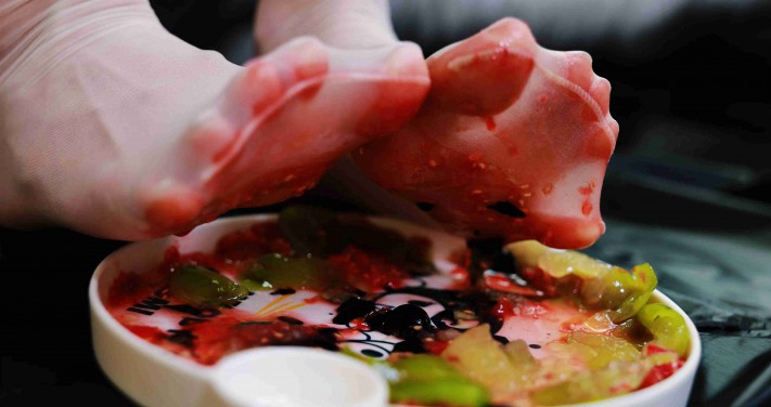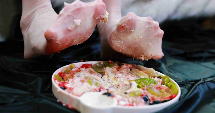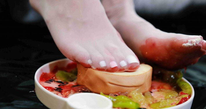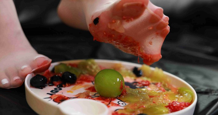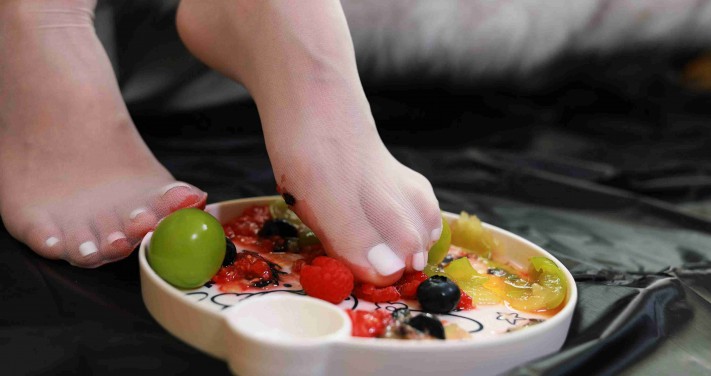 轻音乐伴随丝足制作水果奶油蛋糕美食,舔食玉足美食。