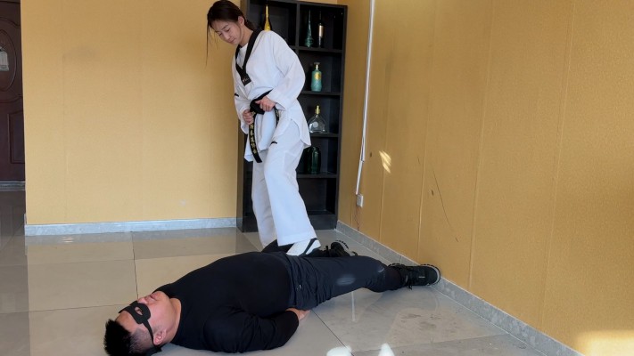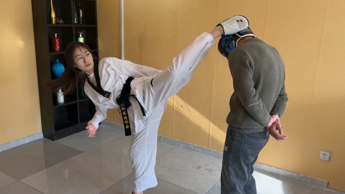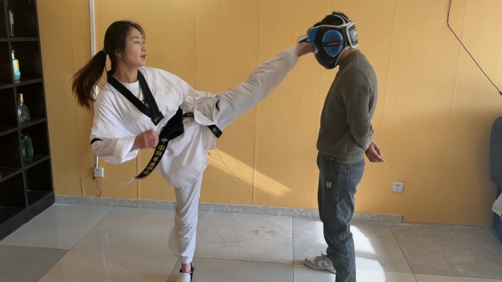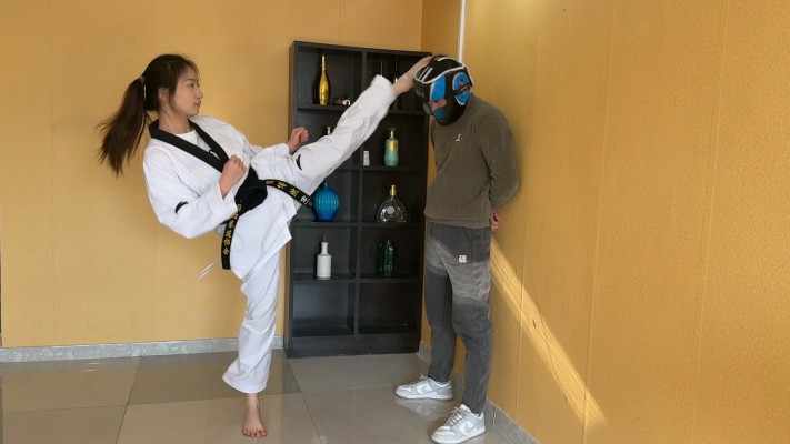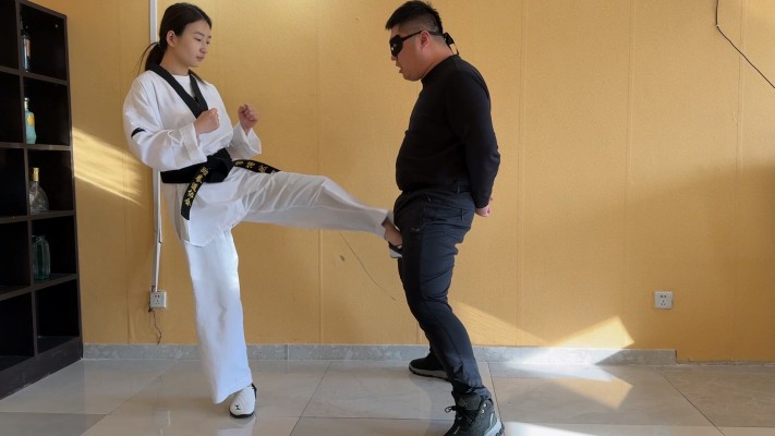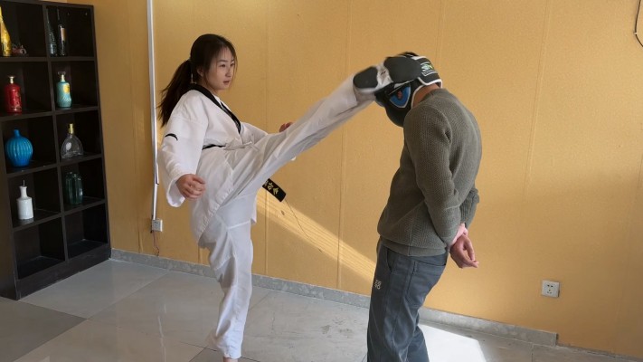 你们呼之欲出的最最最最美跆拳道黑带女教练又一力作上新!本次没有第一部冗长的语言教学讲解部分,直接上来就开踢!然然是专业跆拳道的黑带二段选手兼教练,跟全网里那些随便买一套道服就穿上称之为黑带的女S不同,精湛的脚法和凌厉的踢击动作让你大饱眼福,先是用一个瘦小枯干的男演展示各种高踢腿击打头部,脚脚暴击,男演员基本后面都是晕的,之后又换一个男的继续练习踢裆,不愧是跆拳道黑带,看似力度不大的踢裆腿法,却很是有贯穿穿透力,一脚入魂!希望喜欢然然的大家不要错过。