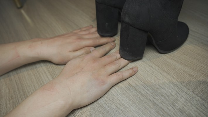 长靴来回溜达无意识踩手,平底鞋放音乐在手上练习跳舞,来回蹦哒,高跟鞋细跟翘起踩手,贱狗的手十指连心剧痛。