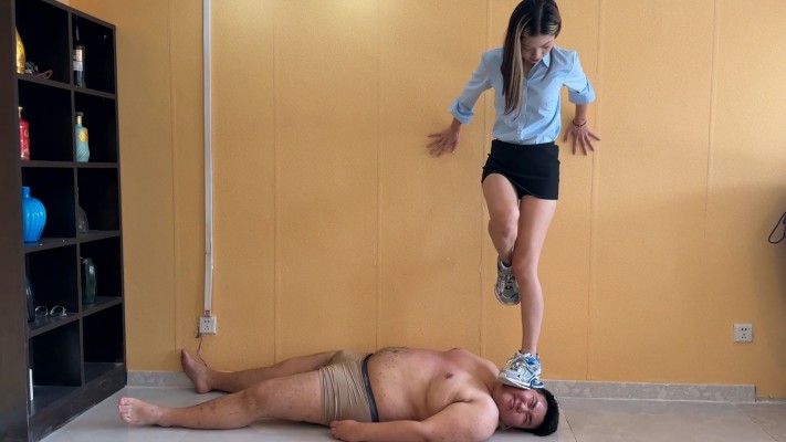 两位女主重度虐踩贱M,兔牙穿着的巴黎世家弹簧鞋,鞋跟看着就杀伤力十足,冰蓝穿的是尖头长筒皮靴,两位女主全体重跳踩猛跺脚下的男M,不管死活就是虐踩,甚至全体重双人踩头!男M眼球都爆突了,脸上鞋印清晰可见。头部下方就是硬硬的地砖毫无缓冲。两位女主心生愉悦一直虐到贱男昏死。