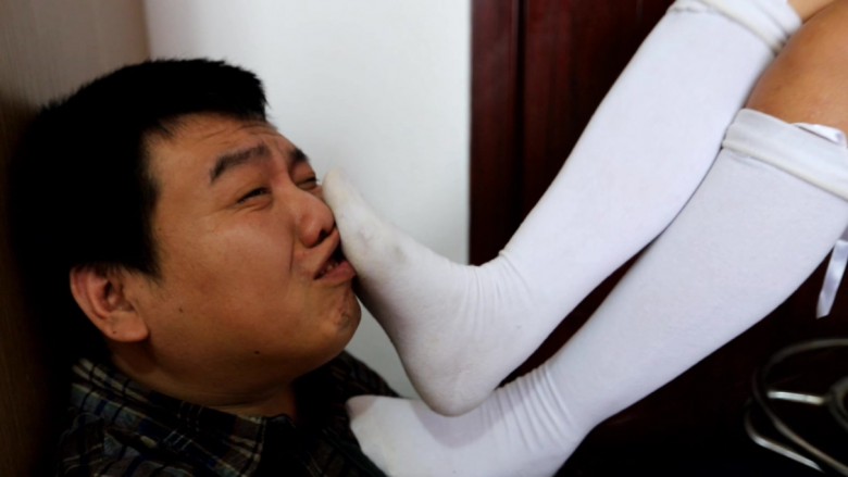 袜子不是配套的,蓝色条纹袜比较干净不太合适,就找了一双之前穿了很久的纯白色的,这双袜子脚底很黑巨臭无比,强迫闻袜子 脚插嘴深喉,舌头当脚垫一点一点的舔袜子。舔鞋底 鞋底也很脏 把鞋底的泥都舔干净。