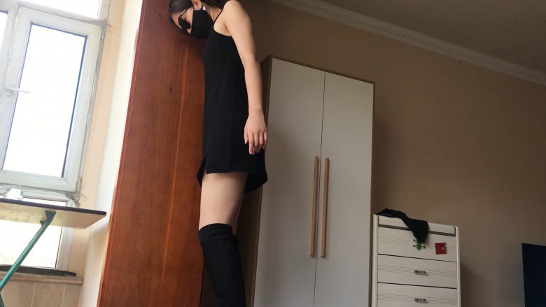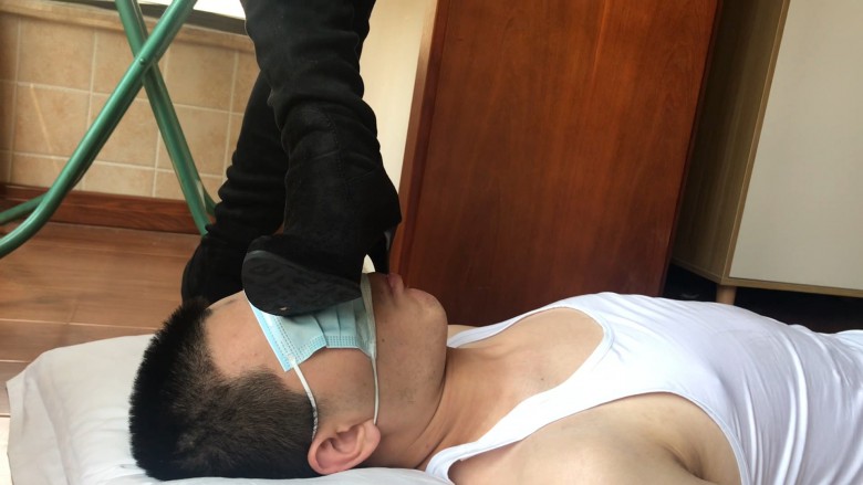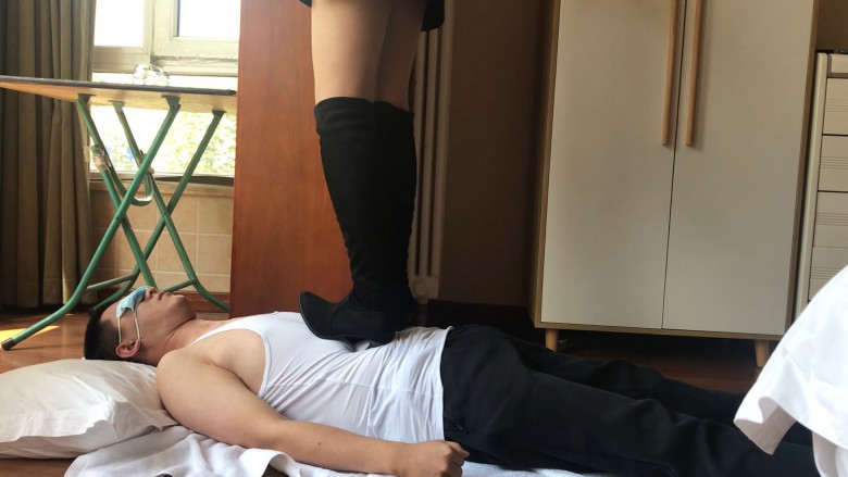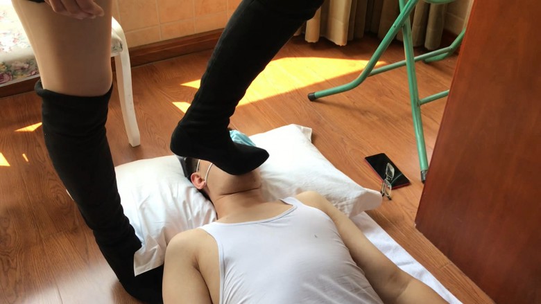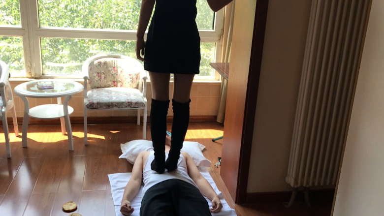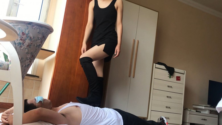 吊带长裙性感长靴全体重踩肚子舔鞋底踩喂面包