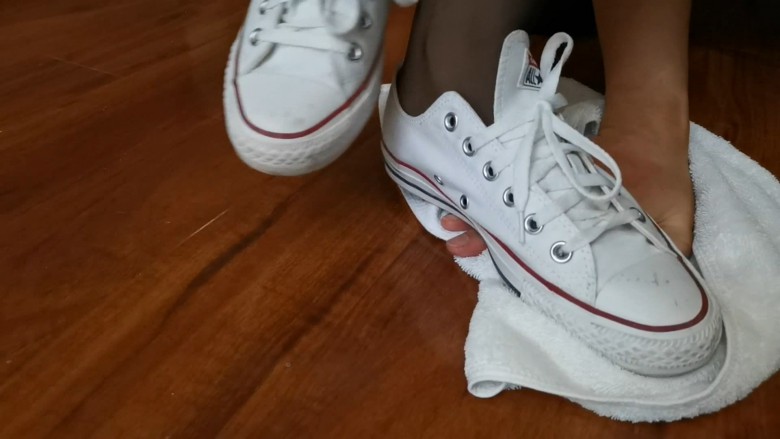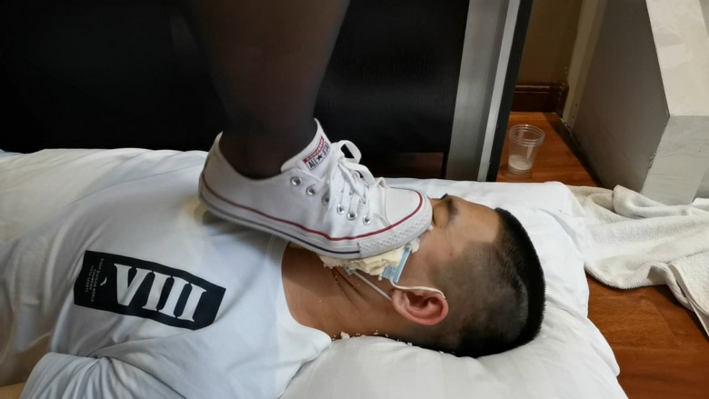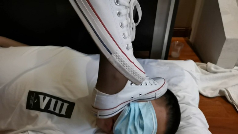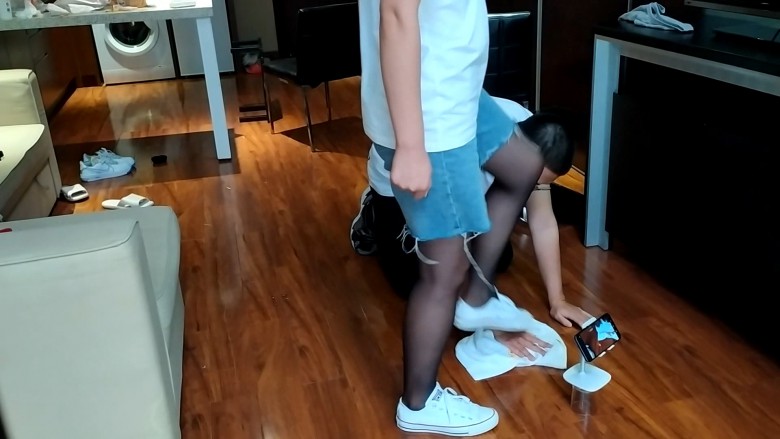 女主穿着黑丝牛仔短裤坐在沙发上,让贱奴跪在地上擦地板,贱奴擦不干净,女主十分生气,大骂了贱奴一顿进行言语侮辱,然后重度碾踩手惩罚贱奴,单脚全体重踩踩出声音,然后擦口水吐在贱奴的手上,让他舔干净,让贱奴躺在地上踩他的脸,把馒头放在他脸上踩,往馒头上吐口水,最后让贱奴把主人踩过的沾满口水的馒头全都吃进肚子里。